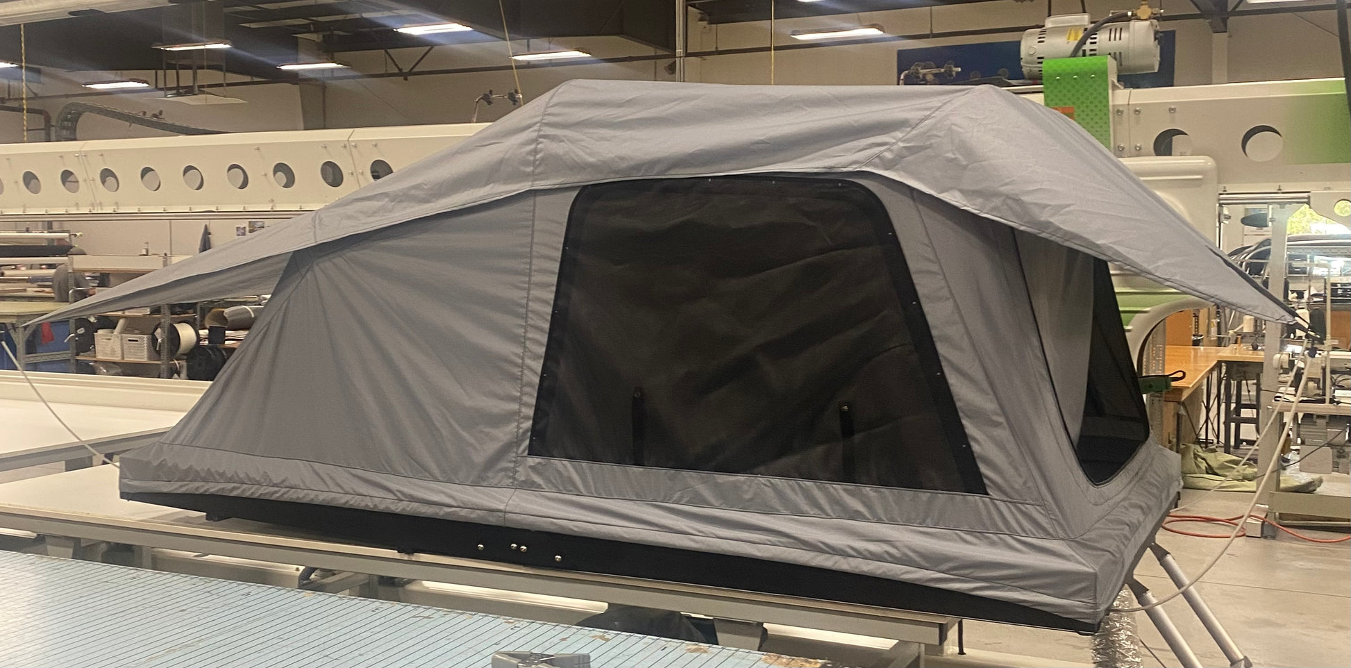 Our Unita 3 is made here in the USA. It's a hard shell outside and folds open to the size of a queen bed with a 2 1/2" memory foam mattress.